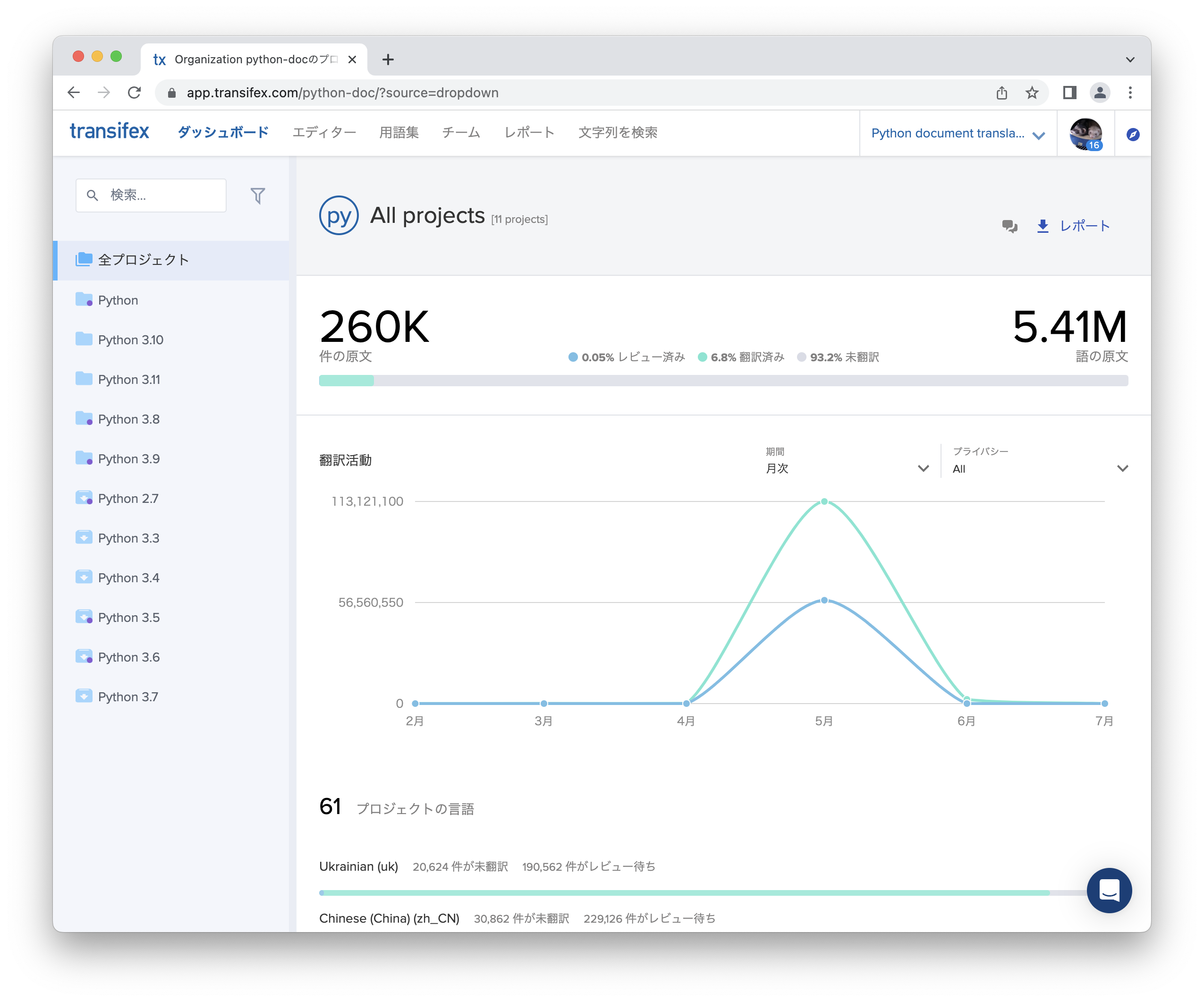 Pythonのパッケージを配布するサイトですが、多言語化されています。 翻訳は以下のサイトで行っています。