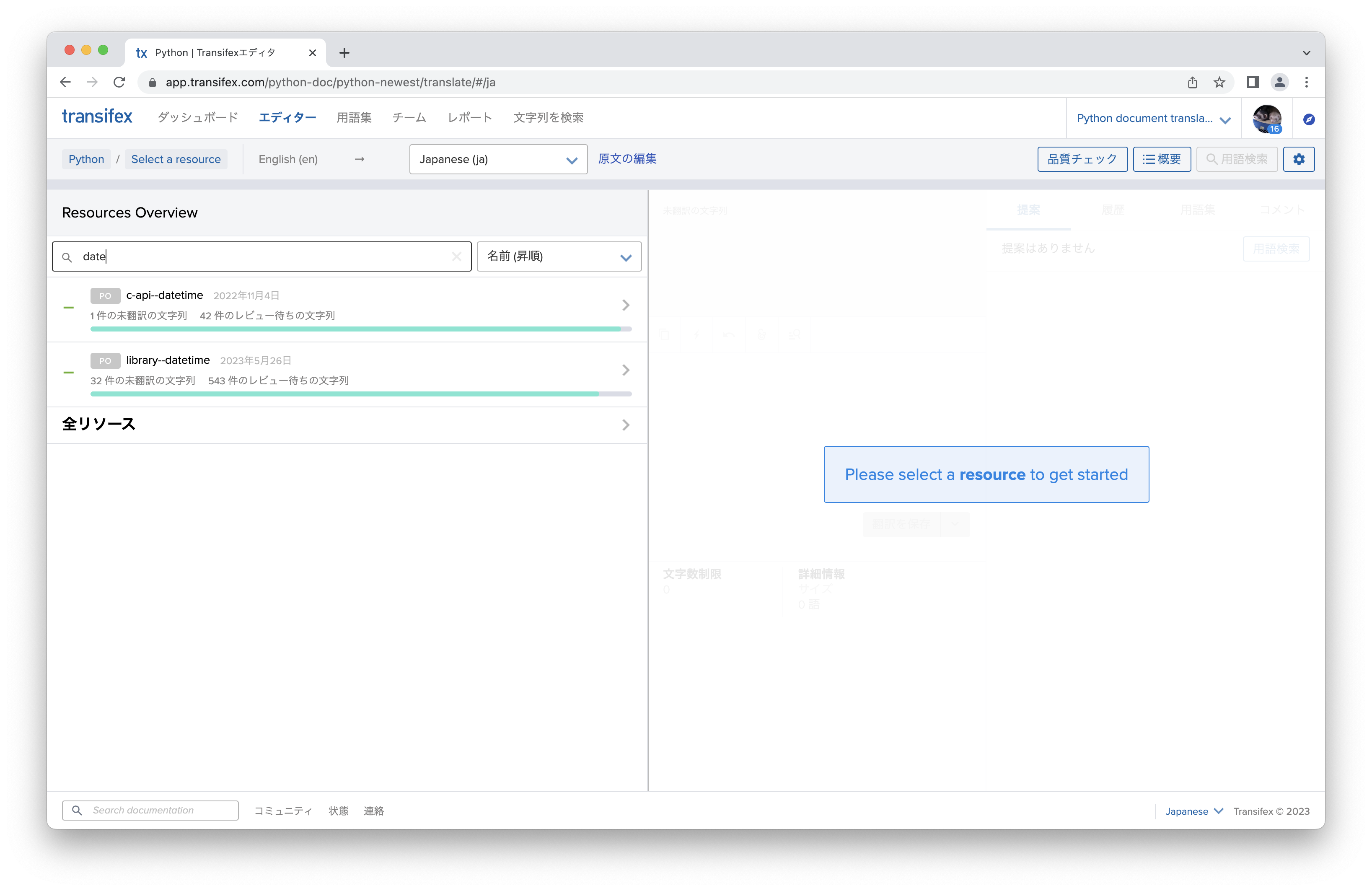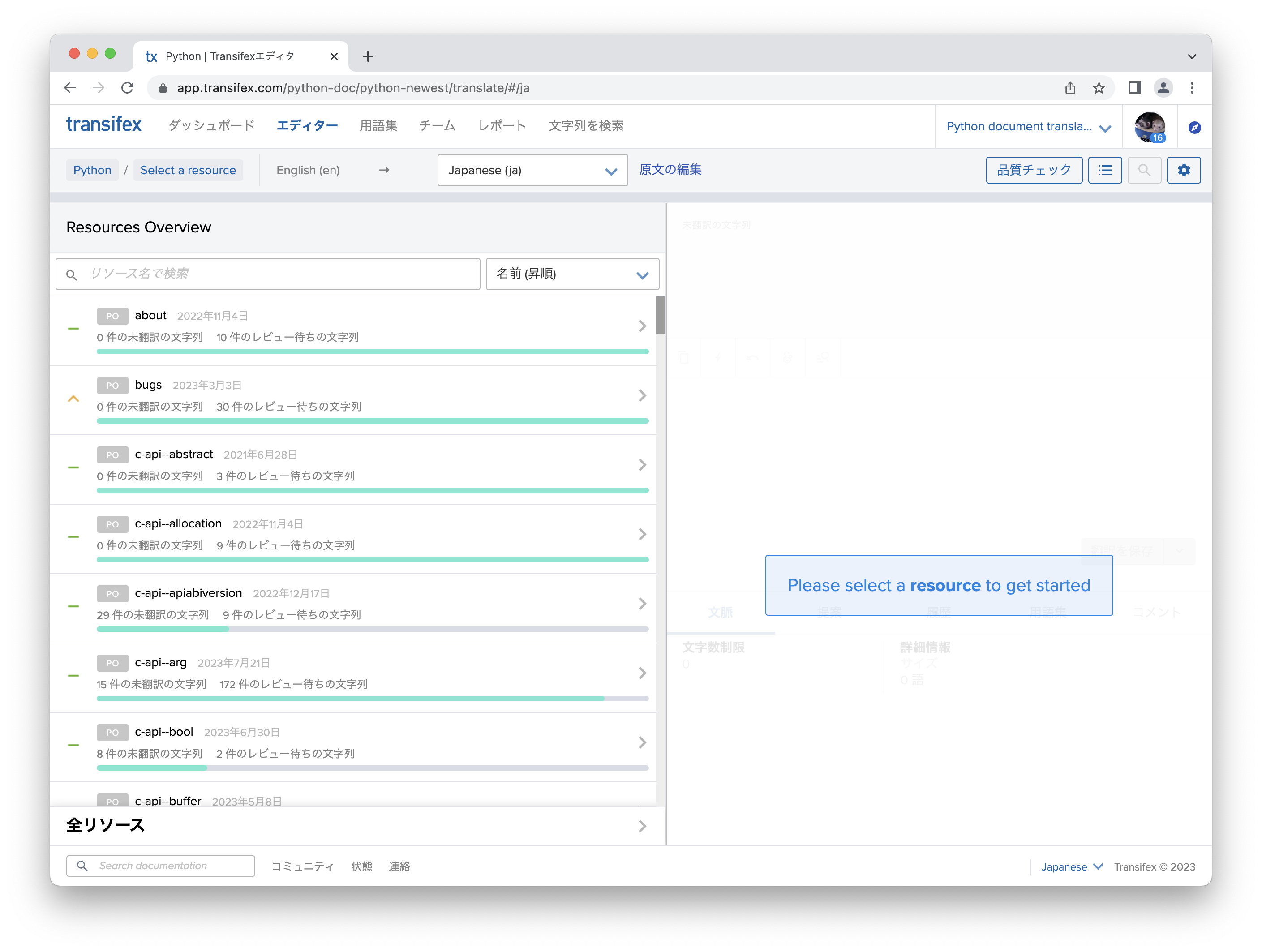 自分が翻訳したいリソースを選択します。 リソースの一覧を見ると「0件の未翻訳の文字列」「29件の未翻訳の文字列」のように、未翻訳の数がわかります。 その数を見て翻訳対象のリソースを決める方法もありますが、Python公式ドキュメントを見て「このドキュメントを翻訳しよう」と着手する方が一般的だと思います。