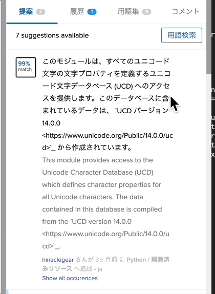 ここでは標準ライブラリのunicodedataを例に見てみます。 翻訳リソースの未翻訳を見てると、1つだけ未翻訳があります。 原文は以下の内容です。