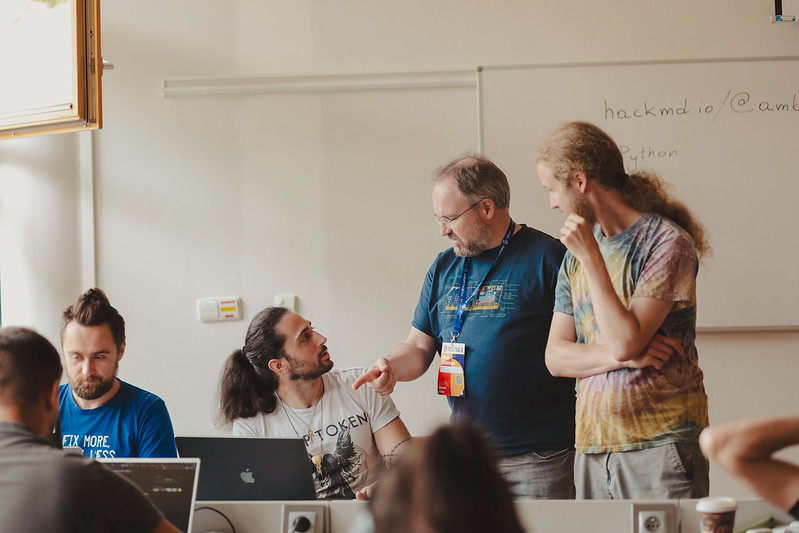 Photo by Braulio Lara / CC BY-NC-SA 4.0 議論中のCPythonコア開発者。左からŁukasz Langa氏、続いてPablo Galindo Salgado氏。さらに、PyConJP 2022のキーノートスピーカーであるMark Shannon氏が目の前に。