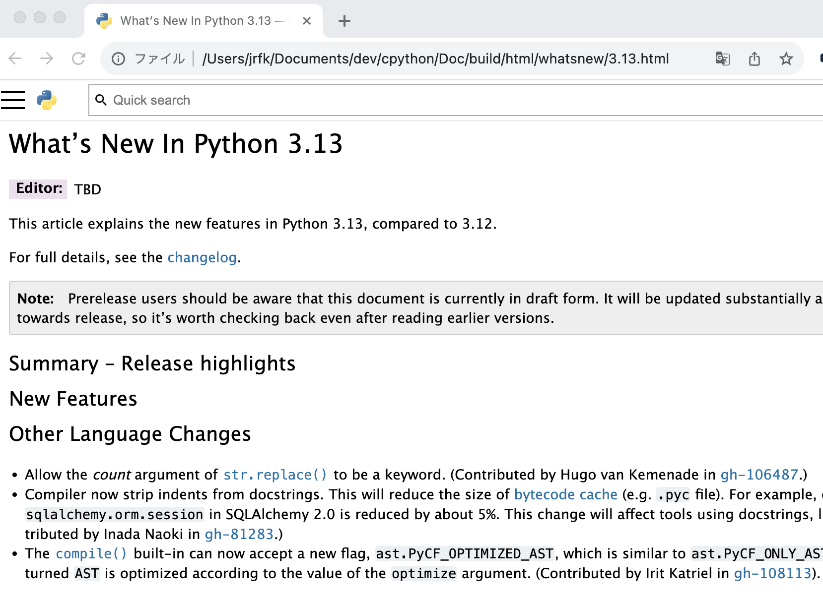 ビルドされたHTMLファイル( cpython/Doc/build/html/index.html )を確認してみましょう。見慣れたドキュメントをブラウザで表示できます。