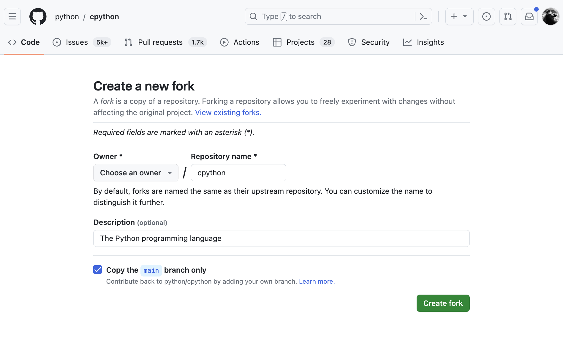 CPythonでは、GitHubのリポジトリをforkして、自分のリポジトリにコピーしてから開発を行います。