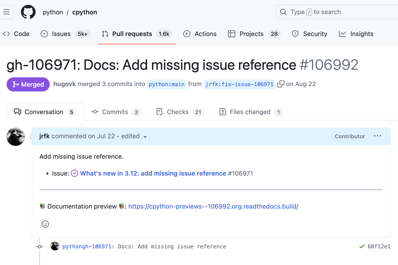 前述の通り、わたしはEuroPython 2023でのスプリントにて、はじめてCPythonへのコントリビュートを行いました。