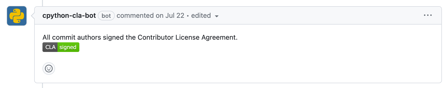 修正を行い、CPythonへのPRを出すと、ライセンスの承諾を要求するボットが自動でコメントします。