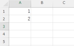 まずは、基本的な使い方について説明します。 新規ファイルを作成し、以下のようにA1セルに1、A2セルに2を入力してください。