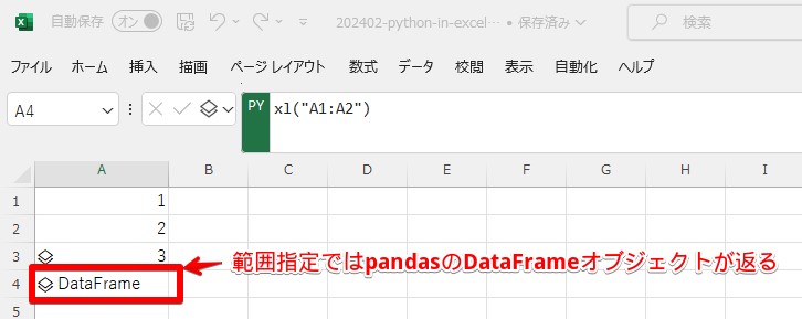また、xl("A1:A2")のようにセルの範囲指定もできます。 対象のセルをドラッグアンドドロップで範囲指定するとxl()関数を自動入力できます。 範囲指定の場合、データがpandasDataFrameオブジェクトとして扱われます。