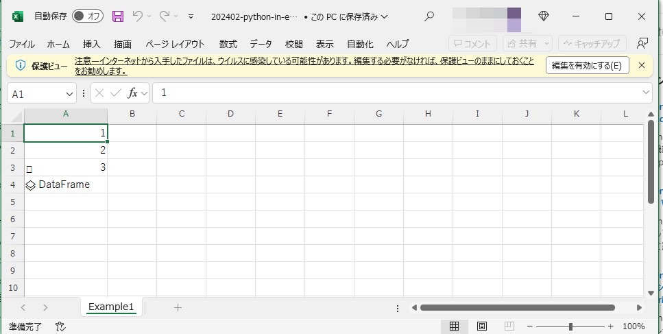 上記ファイルはA3、A4セルに=PY()Excel関数が書かれていますが、表示されているのはExcelファイルを編集する際に計算された値です。 Excel保護ビューが有効になっている状態では、Pythonコードは実行されません。 ネットワークに繋がらない環境でもA3、A4セルの値は表示されます。