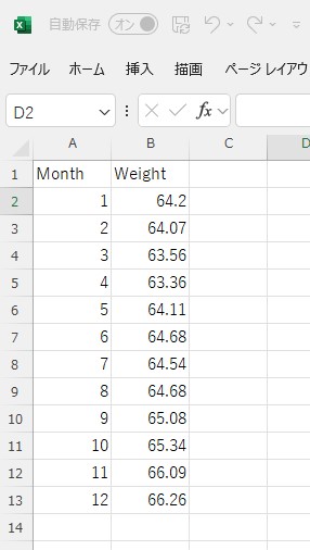 では、コアライブラリのseabornを使って実際にグラフを作成してみましょう。 Excelファイルを新規で作成し、dataシートを作って以下の内容を入力してください。