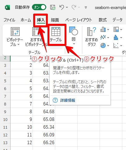 次に、dataシートにテーブルを挿入します。この手順はxl()関数でデータを参照する際に必要です。テーブルの挿入は画面上のメニュー[挿入]-[テーブル]をクリックするか、入力したデータのどこかのセルを選択してCtrl + Tで実行できます。