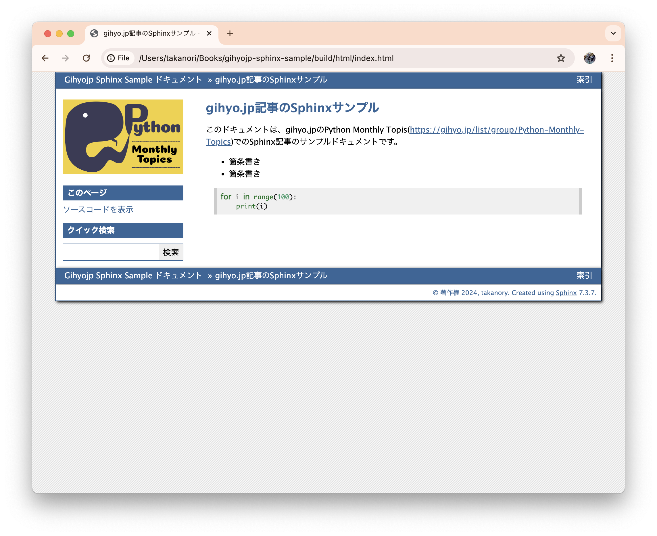 鈴木たかのり(@takanory)です。 今月の「Python Monthly Topics」では、Python製の静的サイトジェネレーターSphinxを使用してWebサイトを構築し、テーマを適用、外部へ公開する流れについて紹介します。 後半ではSphinxの便利な拡張機能を紹介し、Webサイトをより便利にしていきます。