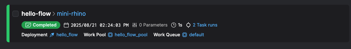 │ Deployment 'hello-flow/hello_flow' successfully created with id '5e07e9a9-6b1f-438d-b37d-6933194bf43f'. │
